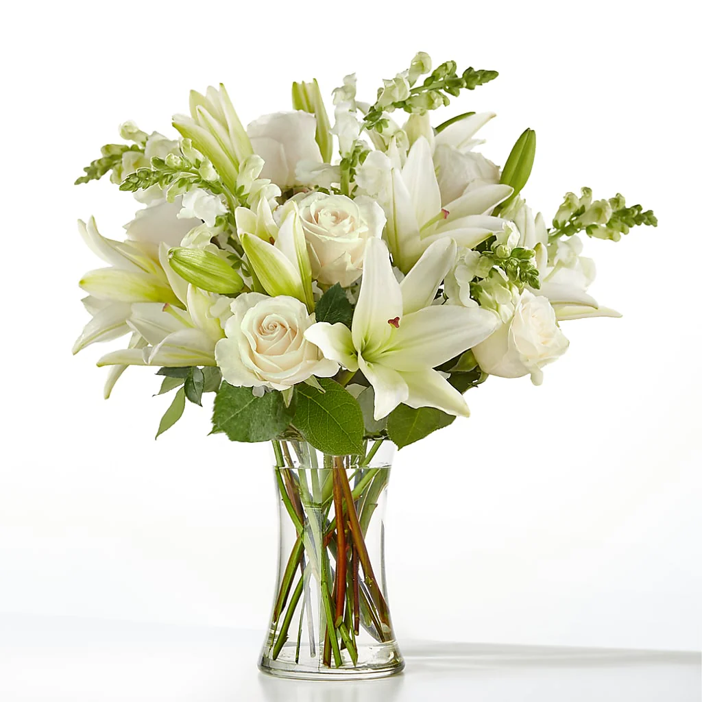 An exuberance of bright and beautiful white blossoms provides an exquisite way to deliver your expressions of sympathy and comfort. This life affirming tribute combines white roses, snapdragons and Asiatic lilies accented by lush greens arranged in a clear glass 8" vase. An excellent choice for a wake, funeral service or for sending your condolences to the home of grieving family or friends.